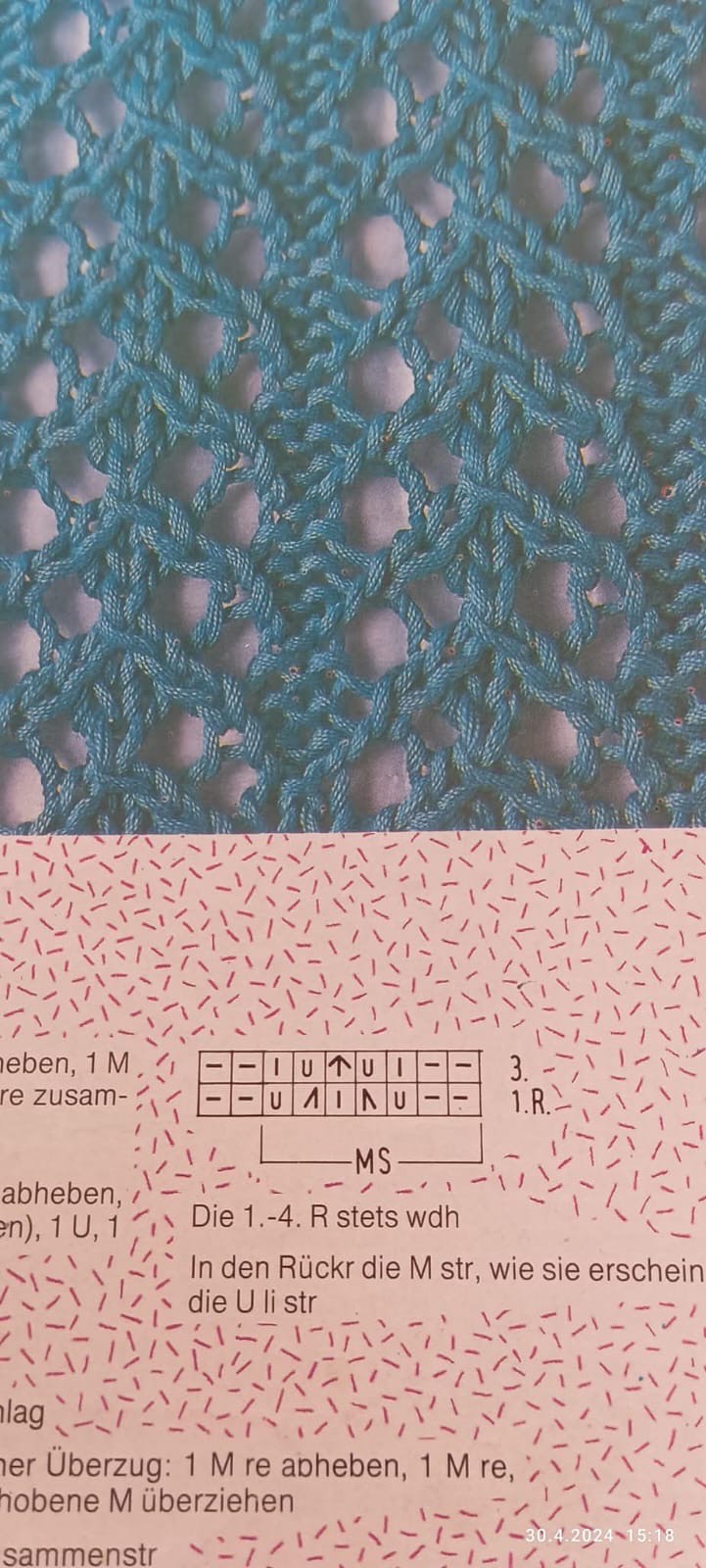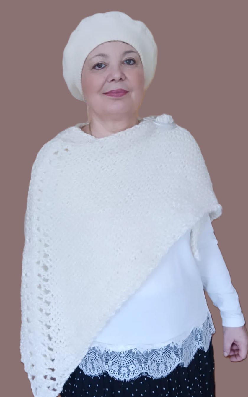 Šátek je upletený z hřejivé příze Stenli Brooklyn. Budeme potřebovat 4 klubka příze. Na kruhovou jehlici č.12 nahodime 7 ok, která upleteme 1 hladce, 5 obrace, 1 hladce. Nyní pleteme v lícové řadě 1 oko hladce, 5 ok ažurovým vzorem, 1 oko hladce. Šátek rozšiřujeme nahozením v lícové řadě vždy za 1. okem a před posledním okem, tato nahození pleteme v rubové řadě hladce anglicky. Poznámka: 1. oko a poslední oko pleteme v lícové a rubové řadě vždy hladce. Pravou a levou stranu pleteme rubovým žerzejem - líc i rub hladce, prostředních 5 ok tvoří ažurový vzor. V celkové výši oka volně ujmeme.